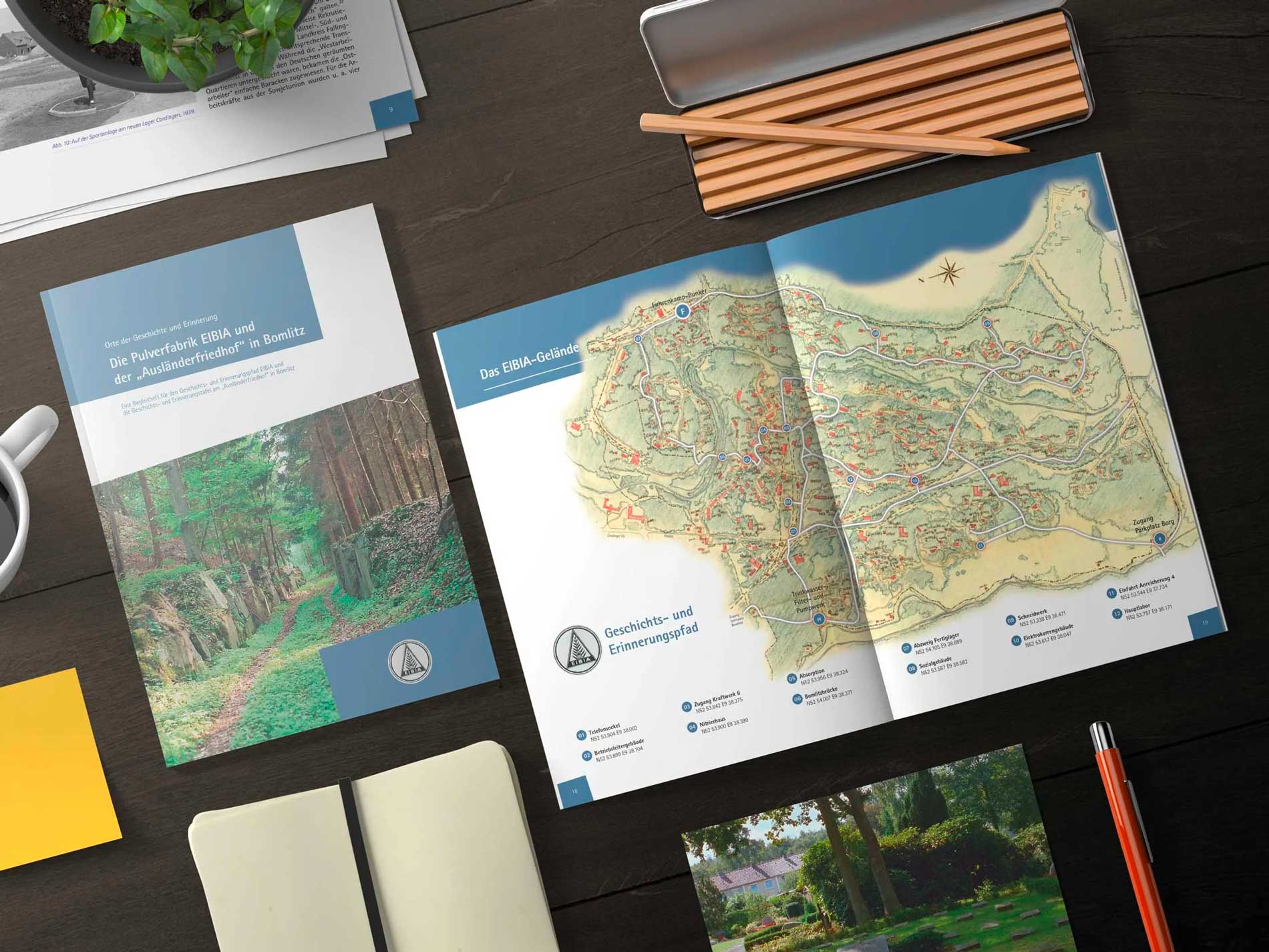 Die Übersichtskarte des Infopfads im Jackentaschenformat und das Begleitheft "Die Pulverfabrik EIBIA und der 'Ausländerfriedhof' in Bomlitz" sind kostenlos und beschreiben die Tafeln an den Stationen des Geschichts-Infopfads. So finden Sie sich auf Ihrer eigenen Entdeckungsreise besser zurecht und können Relikte ausfindig machen und Näheres erfahren.