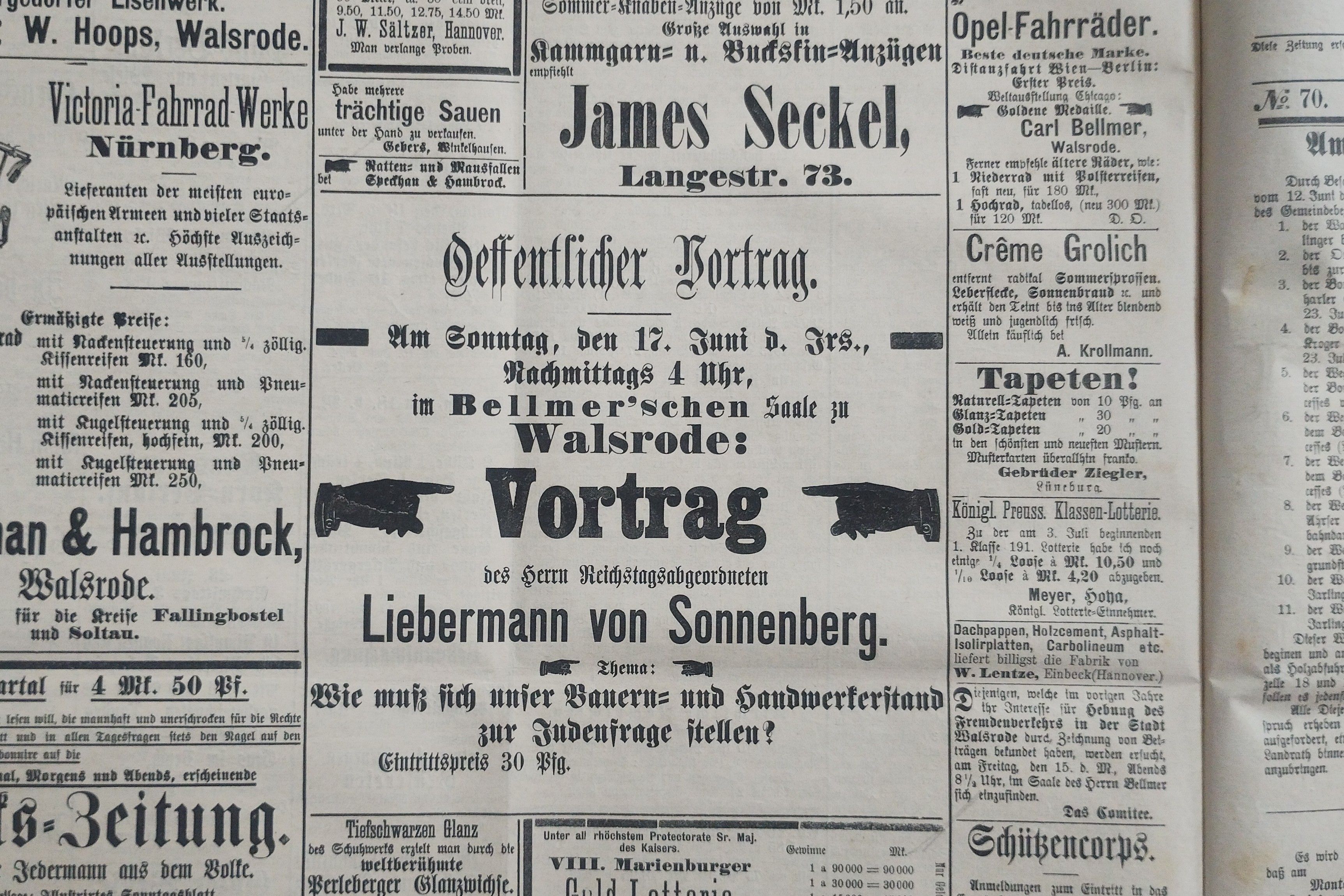 Stadtarchivar Thorsten Neubert-Preine führte für das FORUM durch die Stadt und zeigte den Interessierten z.B. das Gebäude, in dem seinerzeit die Synagoge untergebracht war. Unter den Archivalien, die er für die Gäste mitgebracht hatte, befand sich eine Walsroder Zeitung aus dem Jahr 1894. In ihr warb der Antisemiten-Verein für einen öffentlichen Vortrag des Reichstagsabgeordneten Max Liebermann von Sonnenberg, der ein bekannter Antisemit war. Das Thema des Abends: "Wie muss sich unser Bauern- und Handwerkerstand zur Judenfrage stellen?" Die Grundlagen für die Katastrophe und die Verbrechen an den jüdischen Mitbürgerinnen und -bürgern waren also bereits Jahrzehnte vorher erkennbar.