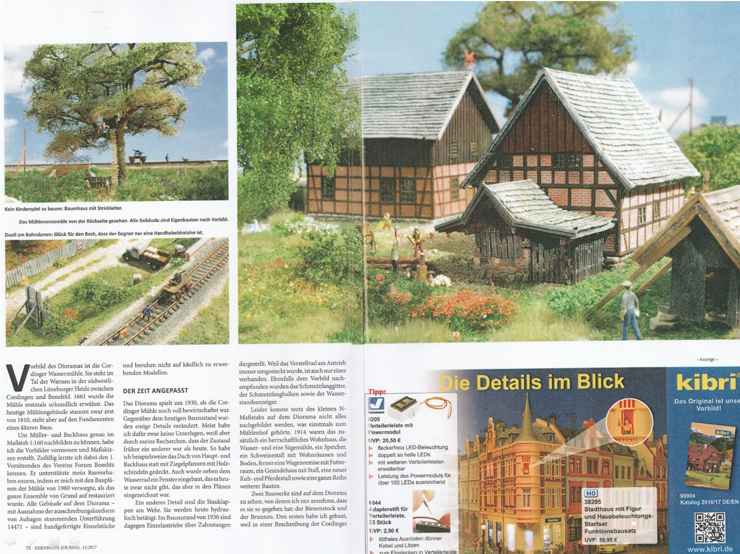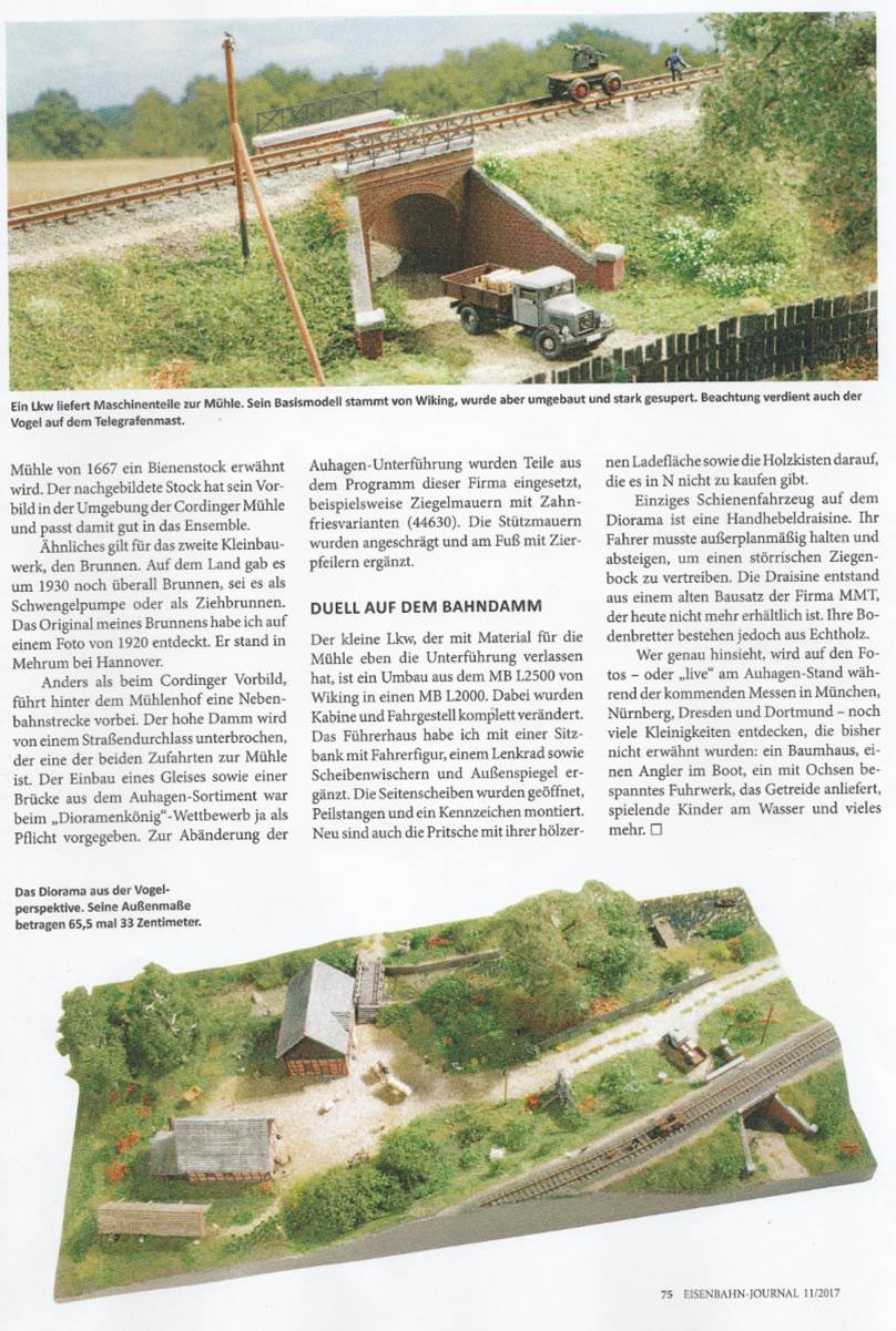 12/2017 - Andreas Galgon aus Hohenhameln ist neuer "Dioramenkönig" beim Wettbewerb der Zeitschrift Eisenbahn-Journal. Mit seinem Modell von der Cordinger Mühle im Verhältnis 1:160 setzte er sich gegen die Mitbewerber durch und bekam von der Jury großes Lob. Während seiner Arbeit am Modell hatte er die Mühle für Vermessungen und Vergleiche besucht und das FORUM über seine Fortschritte auf dem Laufenden gehalten. "Als sich Andreas bei mir zum ersten Mal meldete und fragte, wie viele Fächer wohl das Wasserrad hätte, dachte ich an eine Scherzfrage", schmunzelt Torsten Kleiber vom FORUM. "Sein Modell ist wirklich erstaunlich. Man denkt, man hat Luftbilder der echten Mühle vor sich." Herzlichen Glückwunsch!
