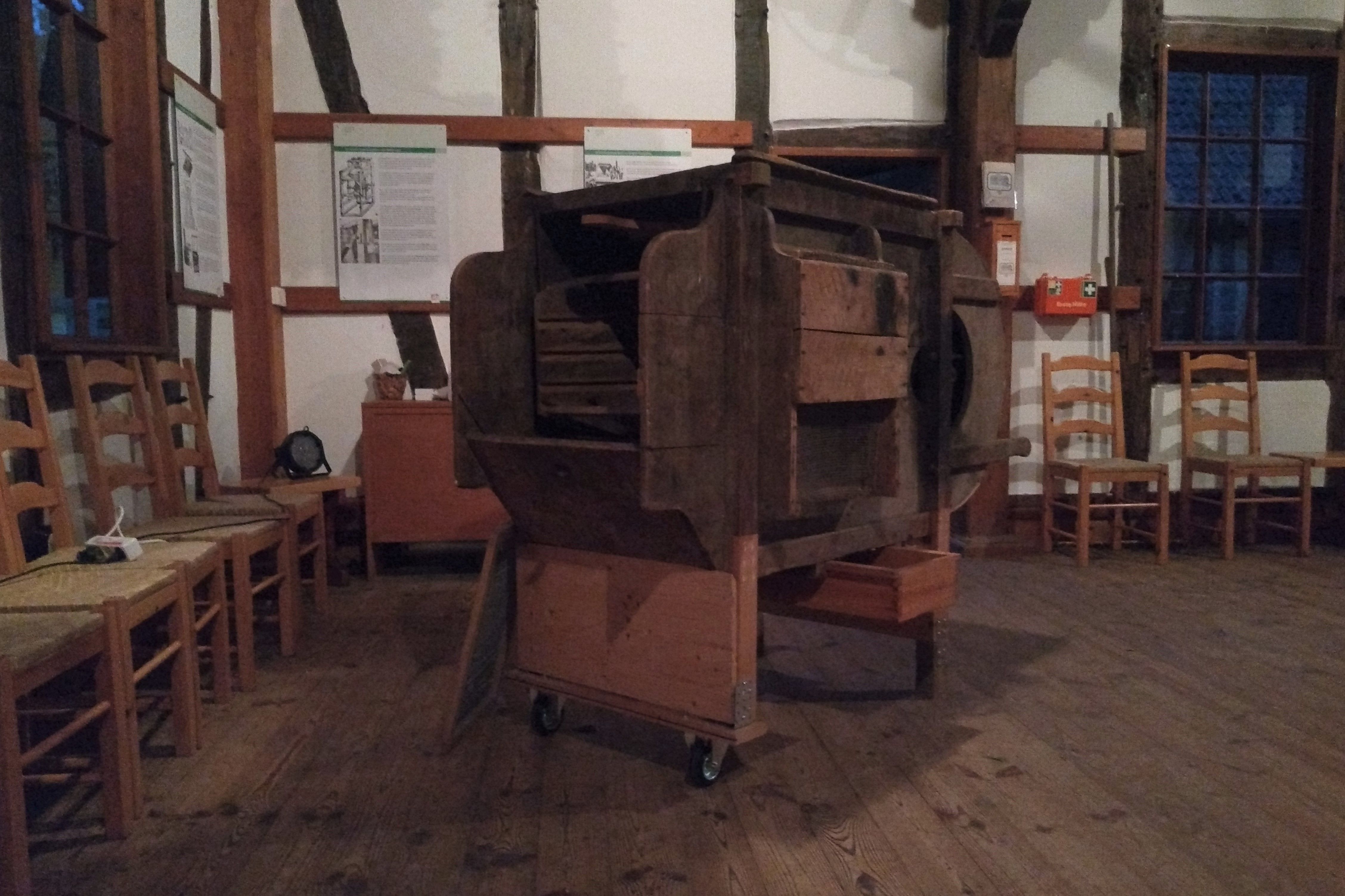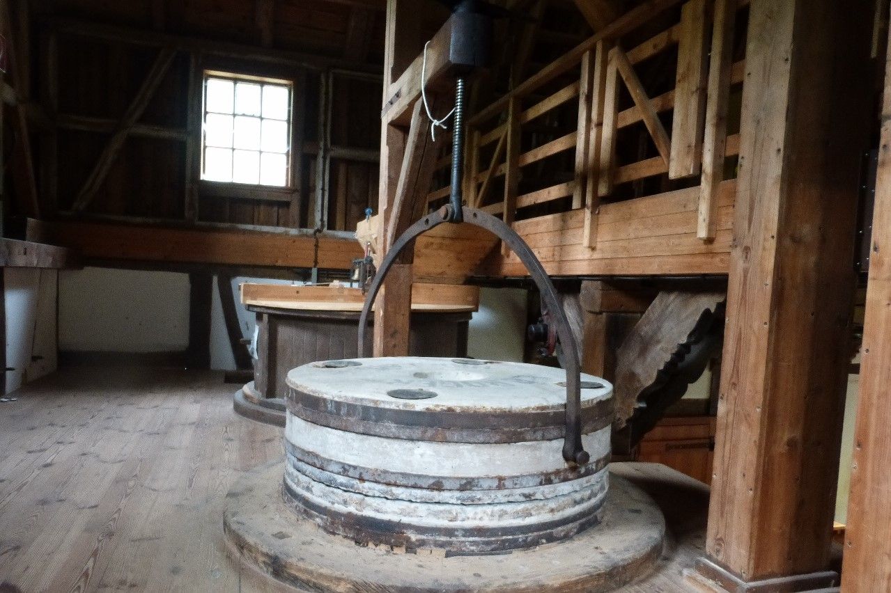03/2021 - In der Cordinger Mühle ist viel kluge Mechanik verbaut, die trotz ihres Alters verblüffend gut funktioniert. Dazu gehört der Steinkran, dessen Funktionsweise der freiwillige Müller Horst Peterson in einem aktuellen Youtube-Video demonstriert. Der Steinkran ist mehr als 130 Jahre alt, was man an den quadratischen Muttern der Holzkonstruktion erkennen kann: Vierkantige Muttern wurden hier bis ca. 1900 genutzt, danach setzten sich sechskantige Muttern durch. Stamm und Ausleger sind aus Fichtenholz. Es würde elastisch reagieren und knarzen, bevor es bei Überlast brechen würde - anders als z.B. das härtere, aber auch sprödere Eichenholz, das einfach ohne Vorwarnung brechen würde. Der Stein, der in dem Video gehoben und bewegt wird, wiegt ca. 1,5 Tonnen.