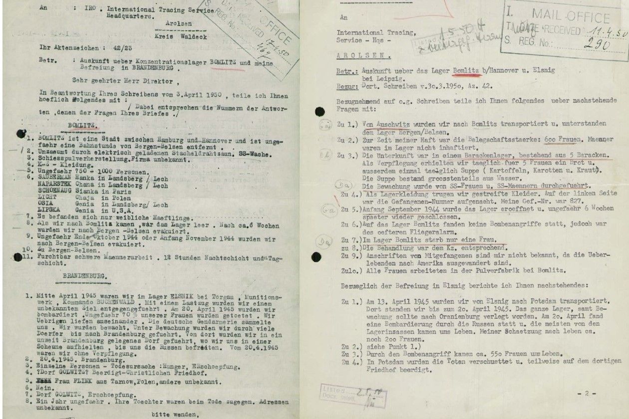 Wer nach dem Stichwort "Bomlitz" sucht, bekommt eine ganze Reihe von Dokumenten-Scans, die mit den Zwangsarbeiterinnen und Zwangsarbeitern zu tun haben, die seinerzeit in der EIBIA arbeiten mussten. Unter anderem findet man Fragebögen, die von den ehemaligen Häftlingen des KZ-Außenlagers Sandberg 1950 ausgefüllt wurden. Etwa 600 polnische Jüdinnen kamen am 3. September 1944 aus dem Vernichtungslager Auschwitz nach Benefeld und wurden anfangs in der EIBIA und später bei Gleisbauarbeiten eingesetzt. In den Fragebögen werden die Haftbedingungen und die Arbeit beschrieben, zu der sie in den sechs Wochen ihrer Lagerhaft in Benefeld gezwungen wurden.