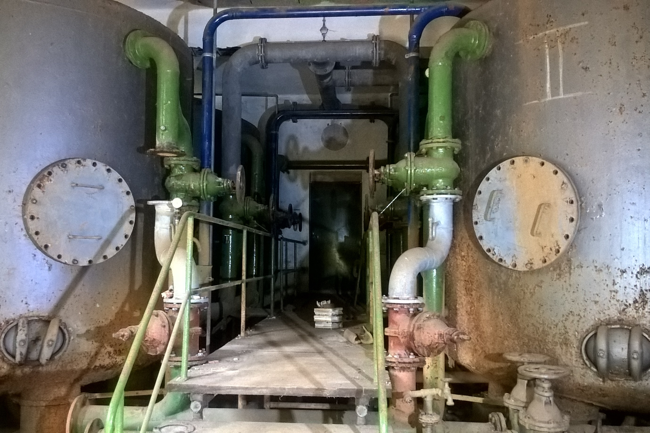06/2018 - Bei sommerlichen Temperaturen kann eine EIBIA-Führung auch durchaus anstrengend sein. Eine Pause kann das FORUM seit einiger Zeit in der Filterstation anbieten. Das gut erhaltene Gebäude war noch bis 1998 das Benefelder Wasserwerk, vier der ehemals sechs großen Behälter stehen noch, die vorderen zwei hat das FORUM herausschweißen lassen, um die Fläche für einen Dokumentationsraum zu nutzen. Das Vorhaben zieht sich zeitlich aber in die Länge: Immer wieder versuchen "Mutige", sich auch ohne Schlüssel Zugang zum Gebäude zu verschaffen, in dem es (wirklich!) nichts zu holen gibt.