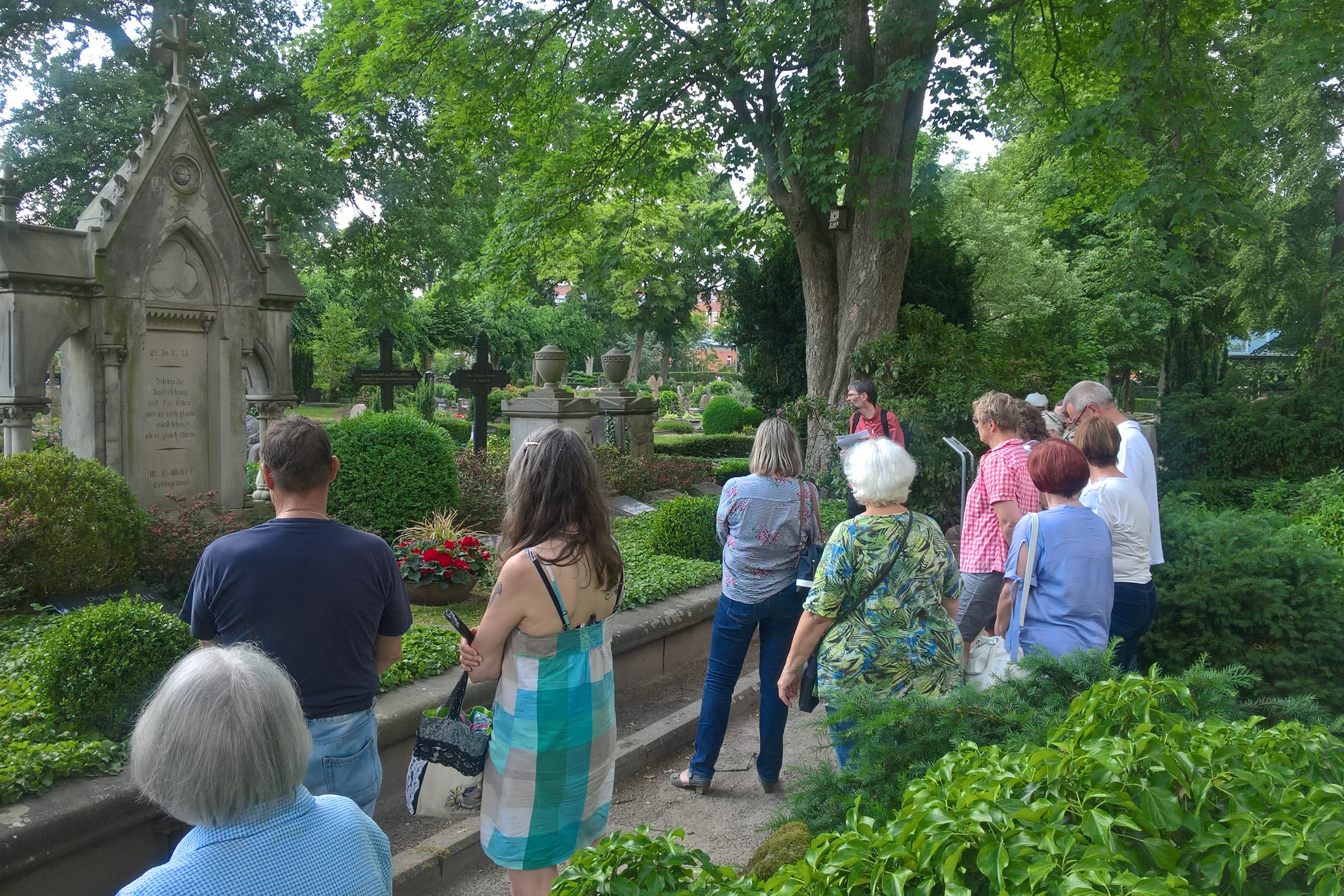 05/2018 - Thorsten Neubert-Preine und Dr. Stephan Heinemann recherchierten zum 200-jährigen Bestehen des Friedhofs Walsrode im Jahr 2015 und erstellten einen historischen Rundweg. Aktuell sind 14 Gräber auf dem Friedhof besonders ausgezeichnet und mit einer Infotafel dokumentiert. Dazu gehört die Grabanlage der Familie Wolff oder die Einzelgräber der Walsroder Bürgermeister Carl Brammer, Friedrich Grütter und Georg Kammerer. Historiker Neubert-Preine führte für das FORUM über den Friedhof und konnte als Stadtarchivar die Persönlichkeiten und Hintergründe für die Gäste vorstellen.