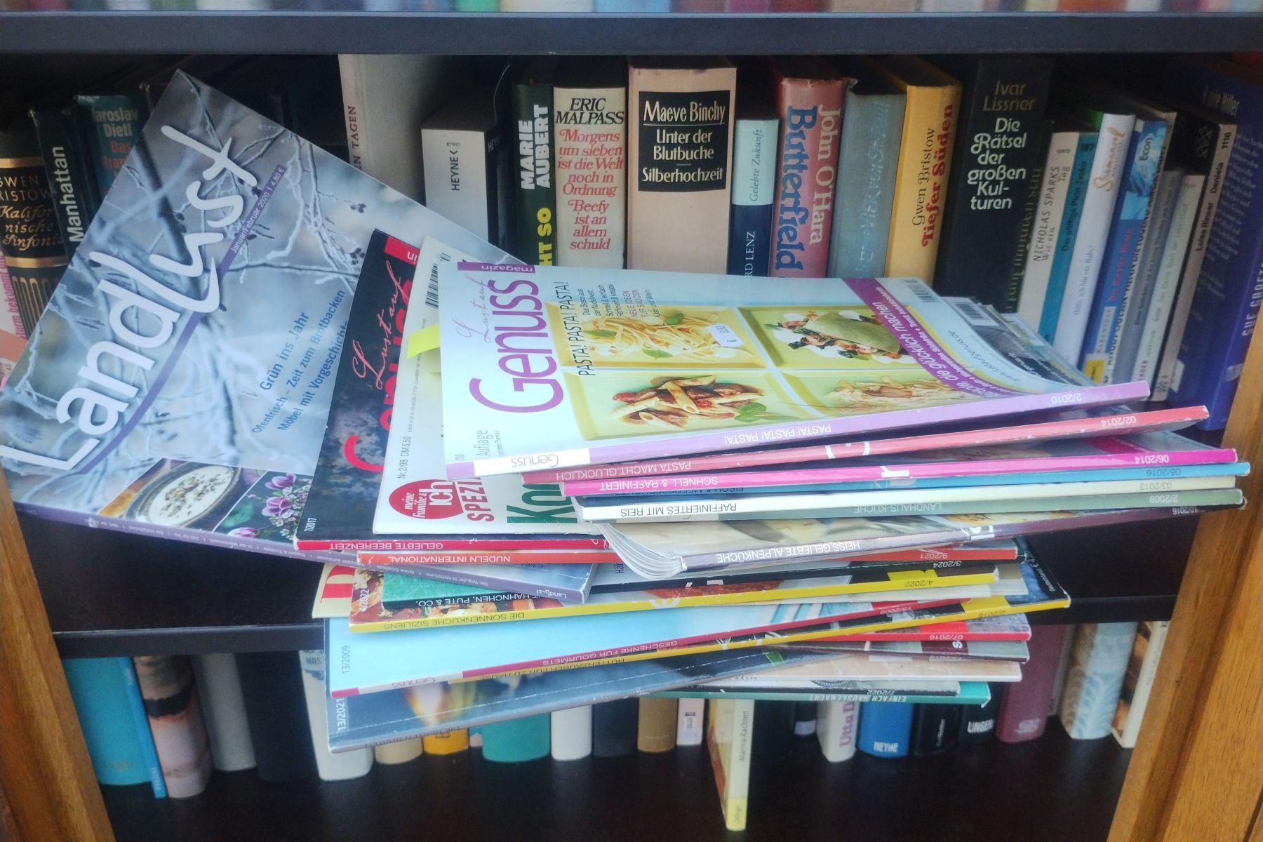 Auch die Installation mit gestopften Zeitschriften wirft sich den allgemeinen Konventionen entgegen und ruft scheinbar "Nicht mit mir!". Sie widersetzt sich couragiert den Bücherschrankregeln, steht da doch klar, dass es ein Bücherschrank und kein "alles Mögliche"-Schrank ist. Besonders kontrastreich sind dabei die Titel der Journale wie "Landlust" oder "Genuss", die mit geradezu biedermeierschem Duktus einen grellen Kontrapunkt setzen zum hineingeschlunzten Altpapier, das aus ihnen am Ende wurde.