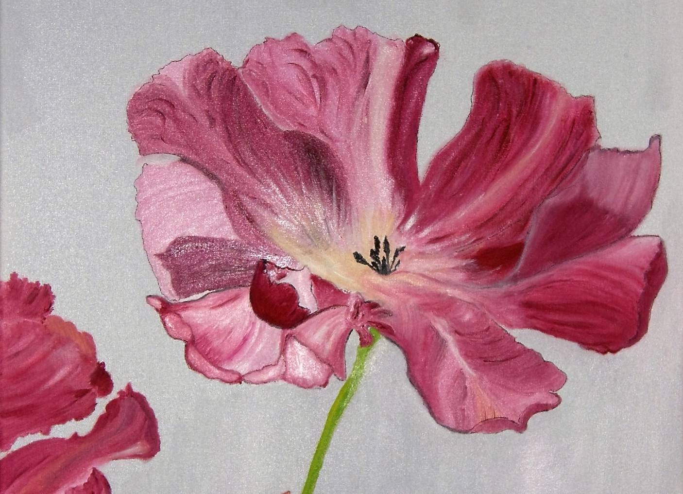 Eröffnet wird ihre kleine Galerie im Dorfgemeinschaftshaus von zwei farbenfrohen Elefanten, die aus dem Dschungel zu treten scheinen. Es folgen unter anderem eindrucksvoll große Blüten in kräftigen Farben und mit deutlichen Konturen. Bei den Aquarellen zeigt sie bei komplizierten Blüten und Stillleben filigrane Kleinarbeit mit Liebe zum Detail. Gut dargestellt ist auch hier die Räumlichkeit des Motivs durch Schattierung.