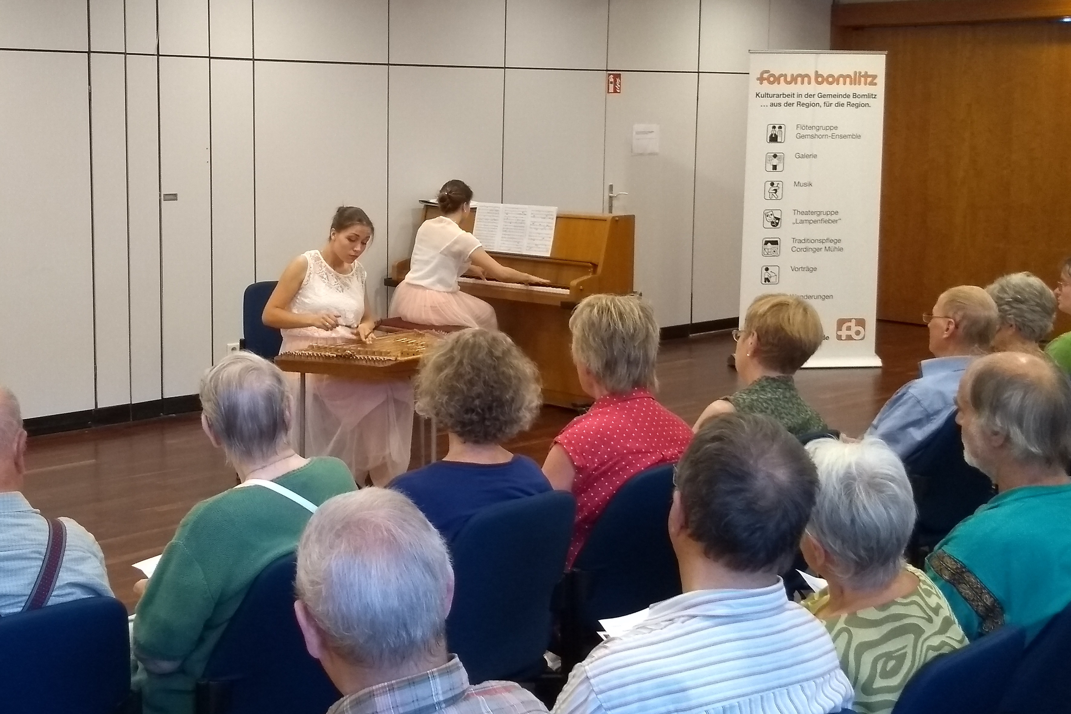 07/2018 - Mit 14 Jahren kamen die Zwillinge Elisaveta und Irina Morosova aus dem weißrussischen Gomel zum ersten Mal mit einem Zimbal-Konzert nach Bomlitz. Sie begeisterten und beeindruckten beim FORUM nicht nur die Konzertbesucher, sondern gewannen auch Freunde hinzu. Mittlerweile sind die beiden jungen Damen fertig studierte Musikerinnen und haben nach wie vor Bomlitz als feste Station im Tourneeplan. Und immer wieder ist die Begeisterung groß, wenn die beiden virtuos und mit großer Musikalität Stücke präsentieren, die mit dem Zimbal ein besonderes Erlebnis werden.