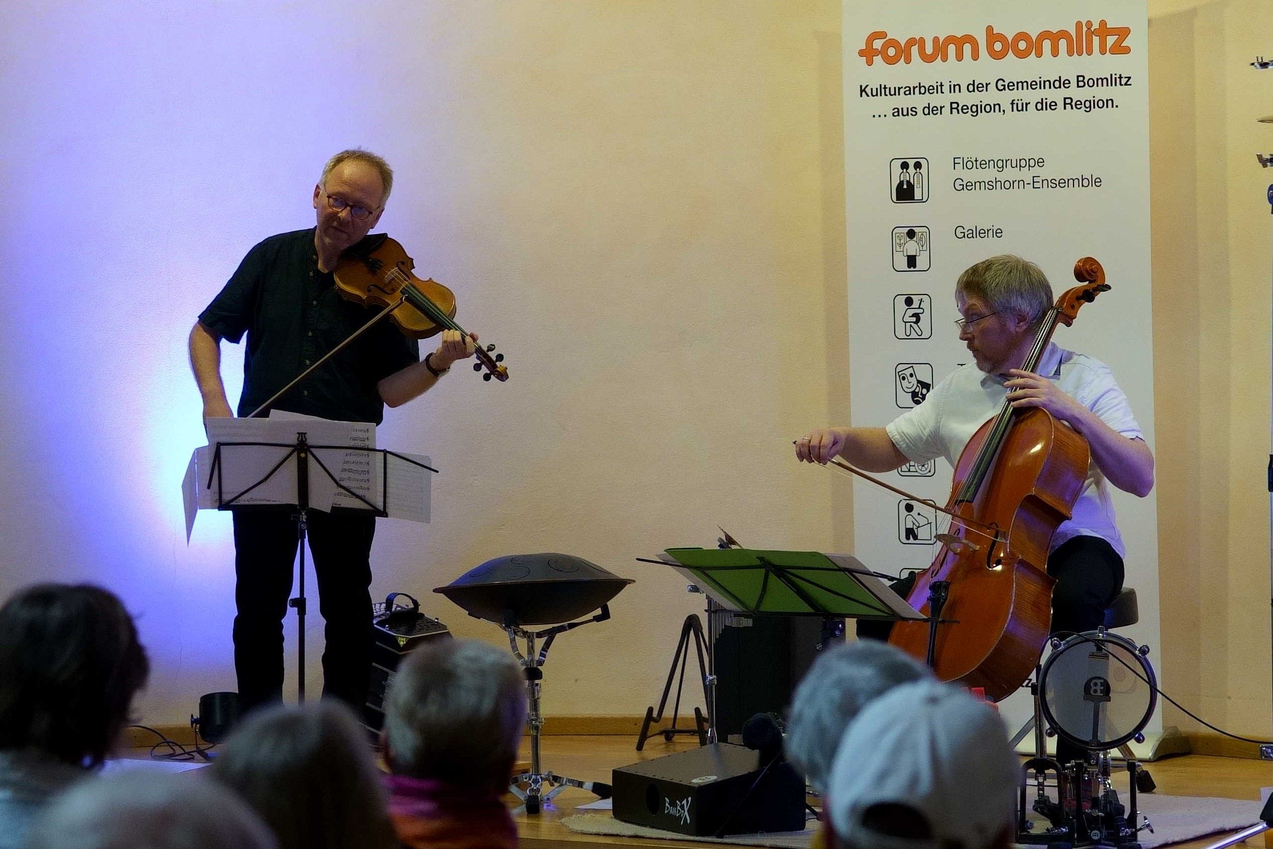 Erst guckte man genauer hin, dann beeindruckte der warme Klang, der durch schlagen wie bei einem Bongo zustandekam. Gleich zwei Zungentrommeln hatte Oliver Walker im Gepäck und passte sich in die Cello-Führung seines Bruders ein. Noten gibt es für die ungewöhnlichen Zungentrommeln nicht. Oliver Walker beherrscht sie trotzdem, und die beiden Brüder sind nach einigen Jahrzehnten gemeinsamer Musik so abgestimmt, dass die erfahrenen Multiinstrumentalisten auch in komplizierteren Passagen wissen, was der andere tut.
