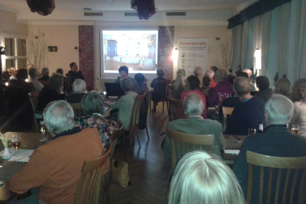 Evgenja Panteleeva-Stammen zeigte nach einem virtuellen Rundgang durch den pracht- und prunkvollen Katharinenpalast und seine Historie Bilder des rekonstruierten Bernsteinzimmers. Und sie kennt den Meister persönlich, der die Nachbildung leitete: Nur an schwarz-weißen Fotos orientiert arbeitete er mit einer Gruppe fast dreißig Jahre lang an dem Kunstwerk, bis es 2003 der Öffentlichkeit übergeben wurde. "Die Idee hatte er in der Küche beim Teetrinken mit Freunden", schmunzelte die Referentin. Wie gut die Gruppe gearbeitet hatte, zeigte sich an einem Original-Mosaik aus dem Bernsteinzimmer, das 1996 gefunden wurde und neben der Rekonstruktion den Besuchern eine Weile gezeigt wurde: Nur Experten konnten mit der Lupe den Unterschied erkennen.