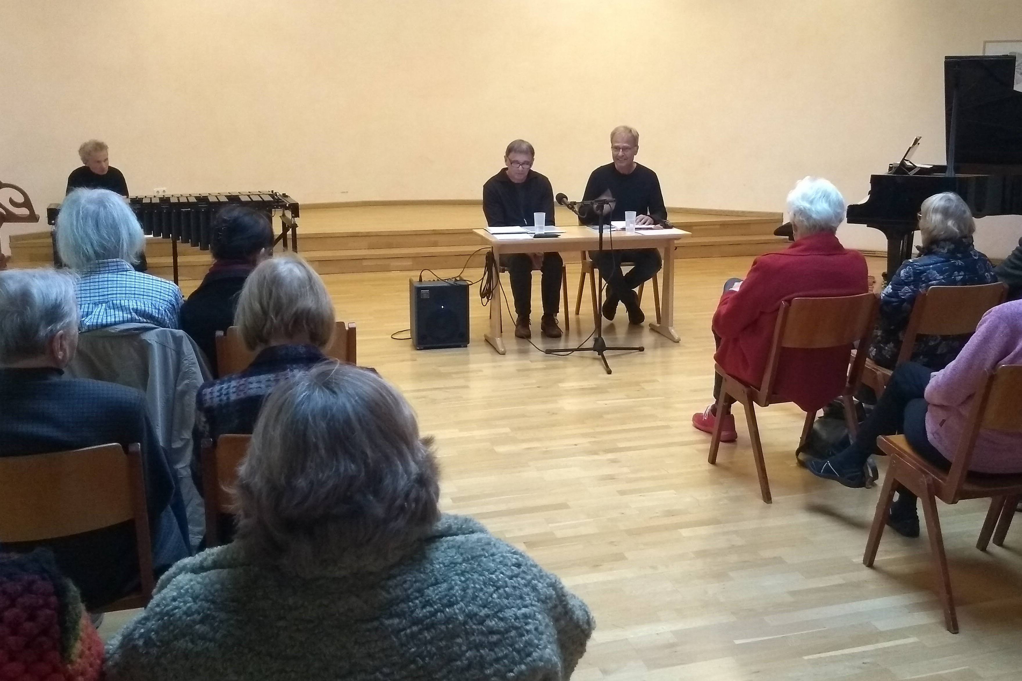 09/2022 - In der Lyrik hat jedes einzelne Wort Gewicht: Jedes kann entscheidende Wirkung bekommen, doppeldeutig sein, Empfindungen durch Inhalt und Klang verstärken oder dadurch Widersprüche erzeugen. Im FORUM präsentierten Thomas Bartsch aus Walsrode und Holger Küls aus Verden den Gästen Gedichte aus ihren bisher veröffentlichten Lyrik-Bänden. Begleitet wurden sie von Andreas Oesterling an Klavier und Vibrafon.