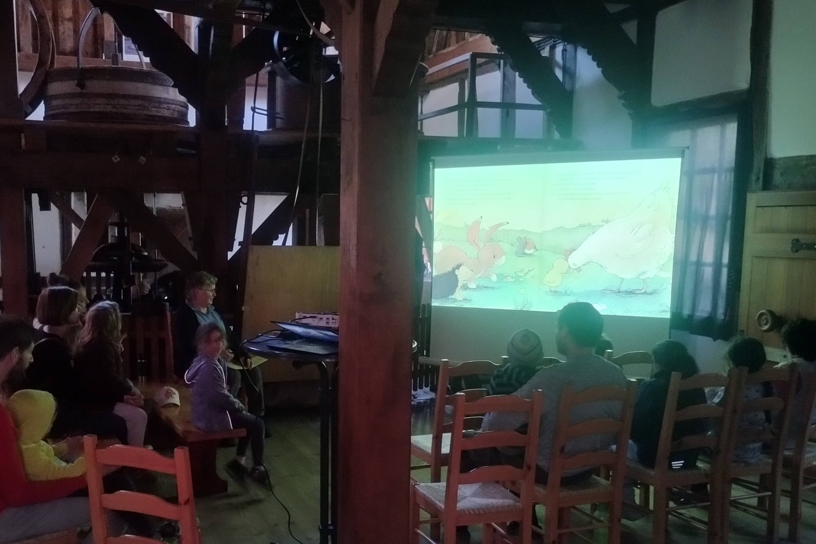 03/2025 - Der Frühling kommt, und Igel und Hase freuen sich, endlich wieder draußen miteinander spielen zu können. Und dann liegt da ein Ei. Und nun? Die schöne Geschichte von Michael Engler mit den liebevollen Bildern von Joelle Tourlonias las Anette Klug vom FORUM im Bilderbuchkino in der Cordinger Mühle. Bei dem anschließenden Mitmachangebot wurden von den Kindern Eier (aus Pappe) bemalt. Das Osterfest kann kommen.