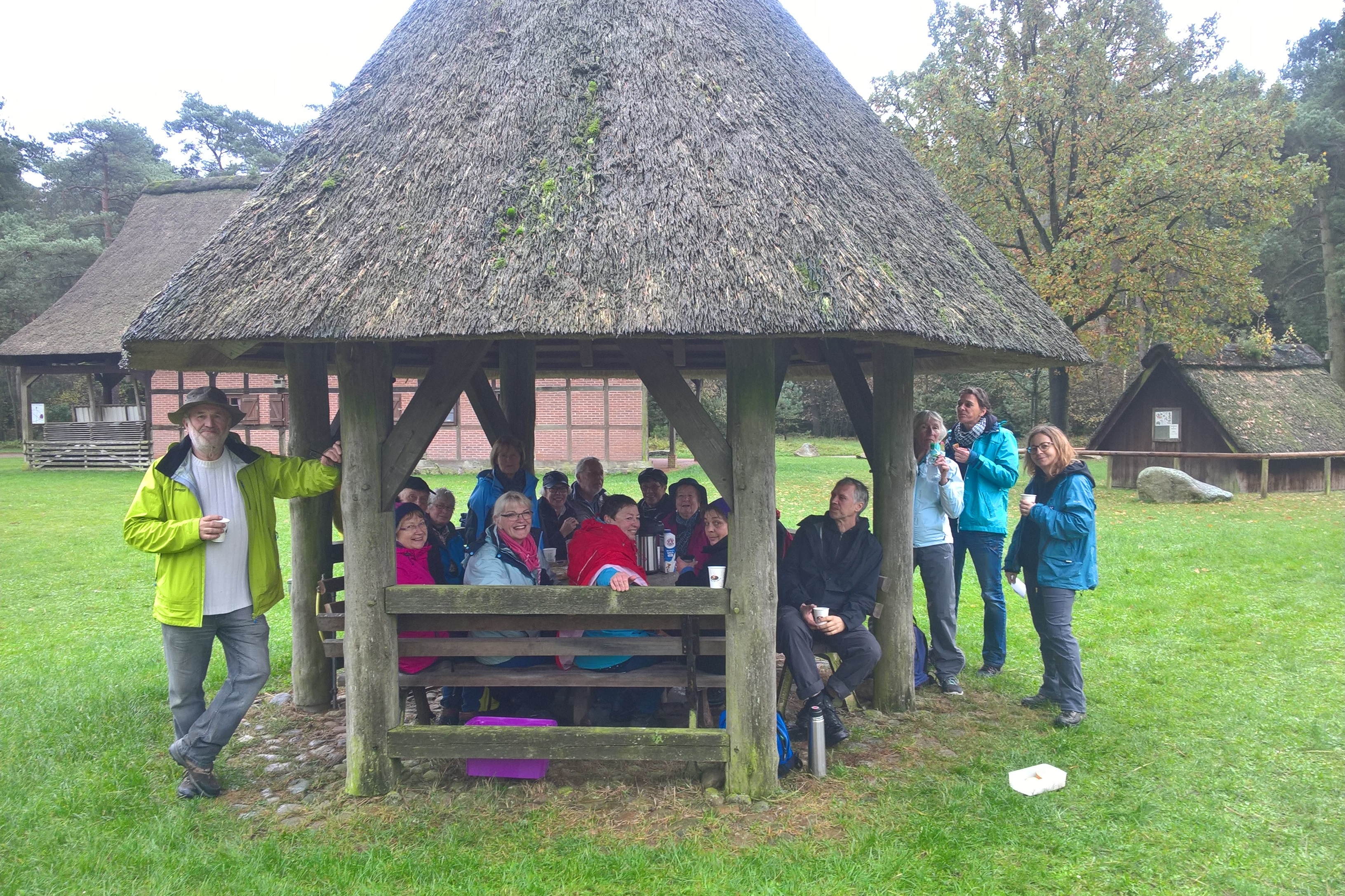 10/2017 - Gäbe es ein "Heidekreis-Kulturerbe", würde der Schäferhof in Neuenkirchen sicherlich dazugehören. Die Anlage umfasst mehrere traditionelle Großgebäude wie Schafstallungen und Wirtschaftsgebäude, und das Gelände ist schön gelegen und gut gepflegt. FORUM-Wanderführer Peter Kloy hat für die Oktober-Wanderung den Schäferhof als Ort für die Kaffeepause auf der 14 Kilometer langen Route ausgewählt und hatte damit wieder einem guten Mix gefunden aus wanderfreundlicher Strecke, Sehenswürdigkeit und Natur. Gestartet wurde am Bahnhof Frielingen, der zeitweise Regen machte der Gruppe nichts aus.